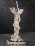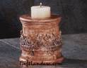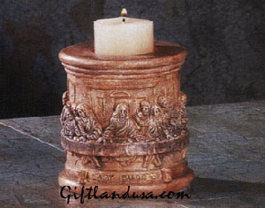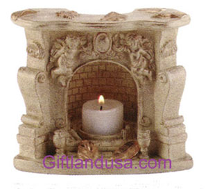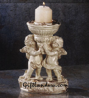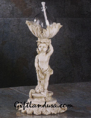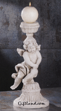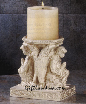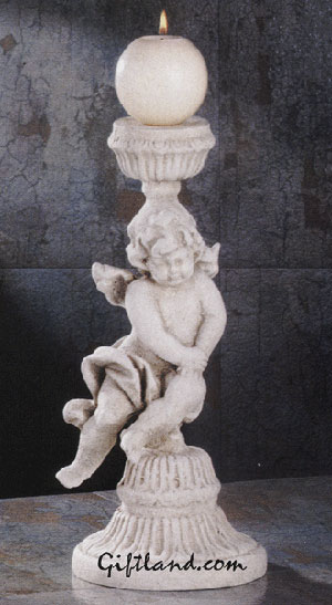 holder with a sand- finish features a cherub resting peacefully. Candle not