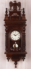 wooden wall clock with Roman numerals has a carved eagle figure on